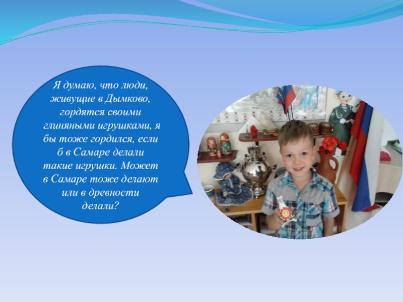 Слайд 3Я думаю, что люди, живущие в Дымково, гордятся своими глиняными игрушками,