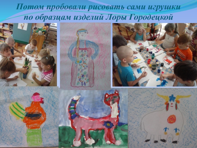 Слайд 25Потом пробовали рисовать сами игрушки по образцам изделий Лоры Городецкой