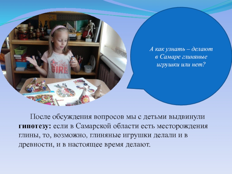 обсуждения вопросов мы с детьми выдвинули гипотезу: если в Самарской области есть месторождения глины, то, возможно, глиняные игрушки делали и в древности, и в настоящее время делают.