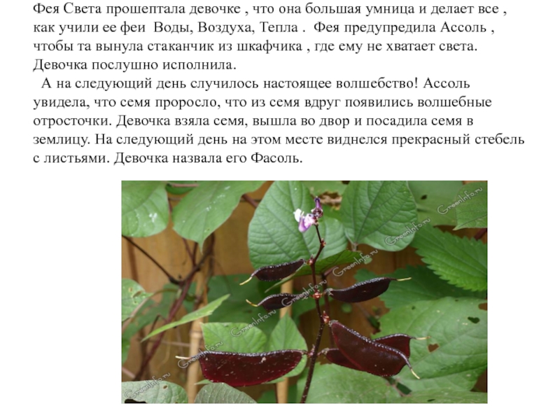А на следующий день случилось настоящее волшебство! Ассоль увидела, что семя проросло, что из семя вдруг появились волшебные отросточки. Девочка взяла семя, вышла во двор и посадила семя в землицу. На следующий день на этом месте виднелся прекрасный стебель с листьями. Девочка назвала его Фасоль.