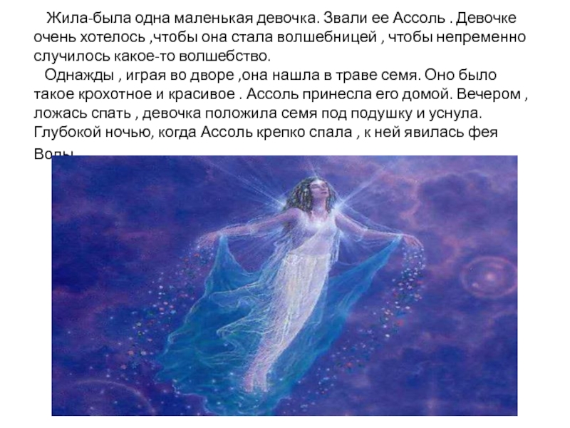 Однажды , играя во дворе ,она нашла в траве семя. Оно было такое крохотное и красивое . Ассоль принесла его домой. Вечером , ложась спать , девочка положила семя под подушку и уснула. Глубокой ночью, когда Ассоль крепко спала , к ней явилась фея Воды.