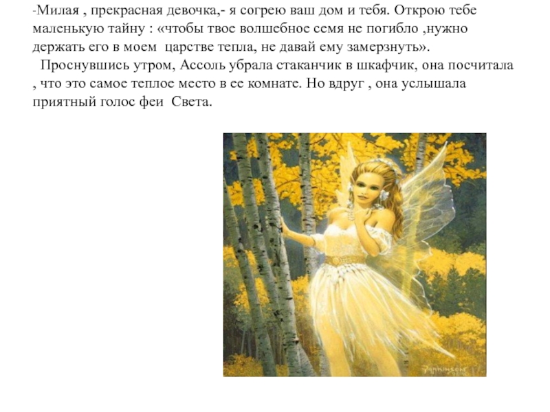 Слайд 8-Милая , прекрасная девочка,- я согрею ваш дом и тебя. Открою