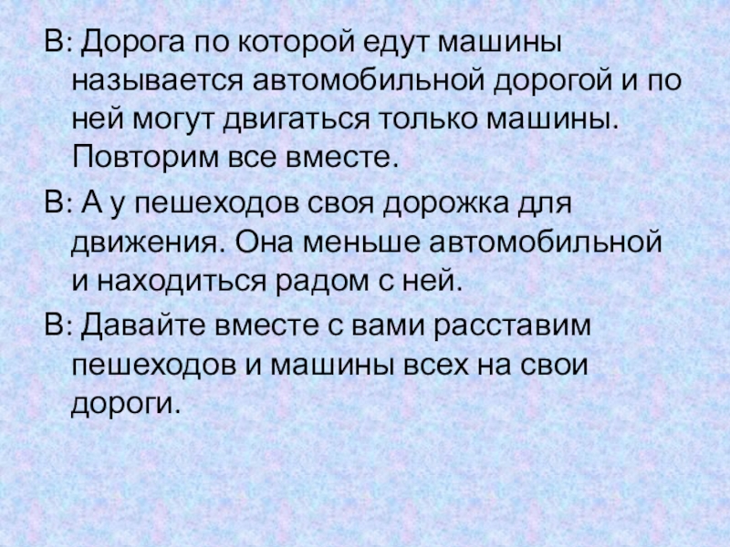 В: Дорога по которой едут машины называется автомобильной дорогой и по ней могут двигаться только машины. Повторим