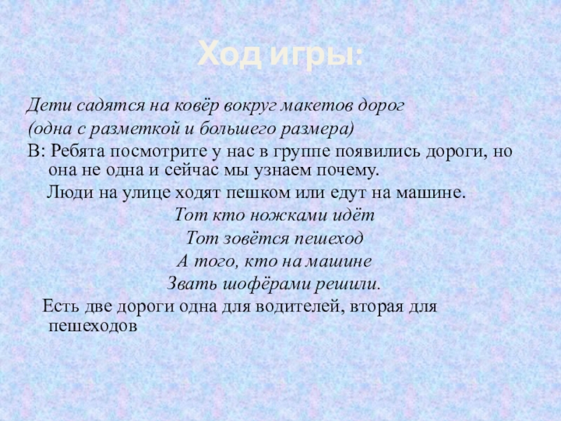 Ход игры:Дети садятся на ковёр вокруг макетов дорог(одна с разметкой и большего размера)В: Ребята посмотрите у нас