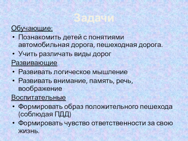 ЗадачиОбучающие:Познакомить детей с понятиями автомобильная дорога, пешеходная дорога.Учить различать виды дорогРазвивающиеРазвивать логическое мышлениеРазвивать внимание, память, речь, воображениеВоспитательныеФормировать