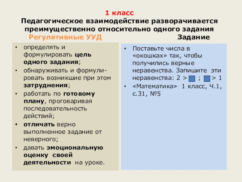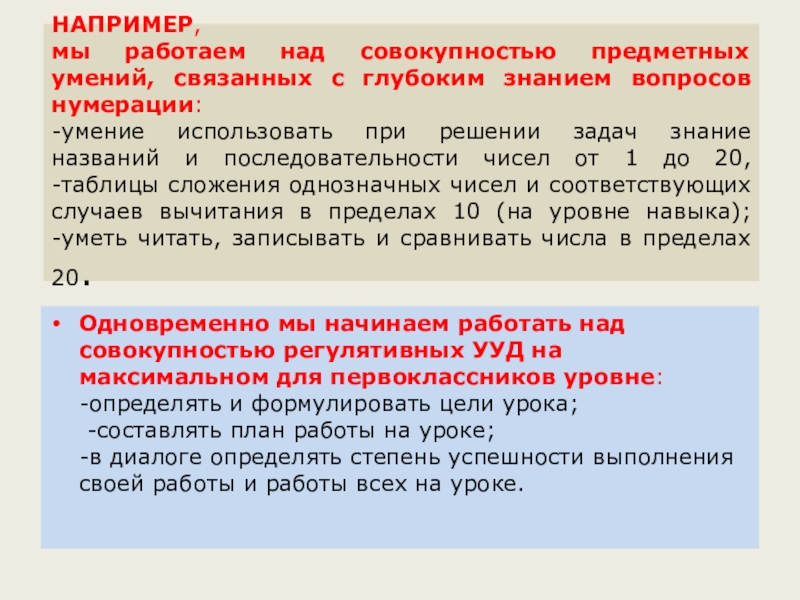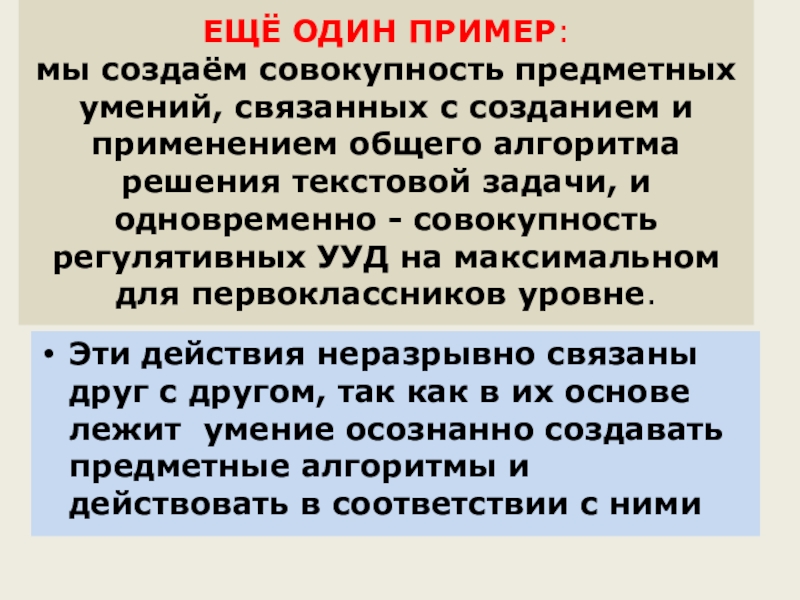 и применением общего алгоритма решения текстовой задачи, и одновременно - совокупность регулятивных УУД на максимальном для первоклассников уровне.