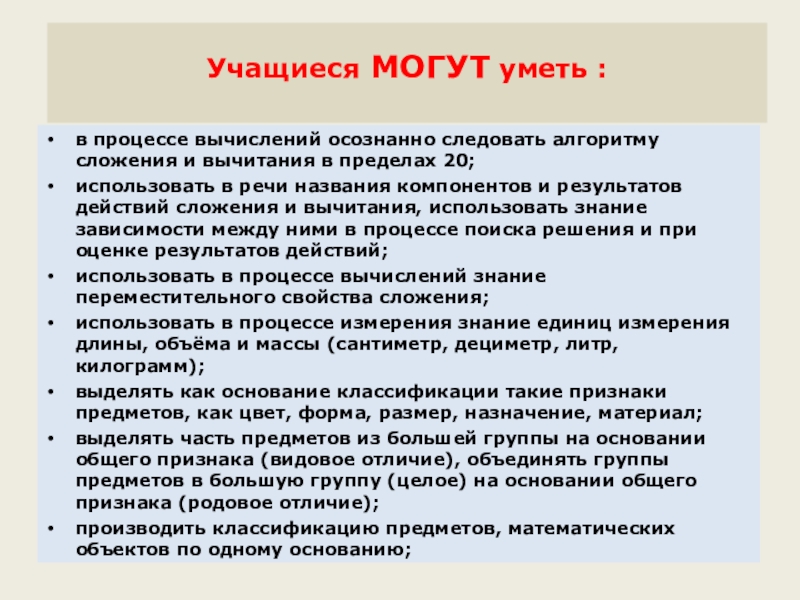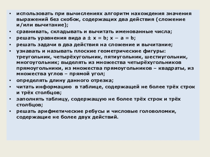 -таблицы сложения однозначных чисел и соответствующих случаев вычитания в пределах 10 (на уровне навыка);