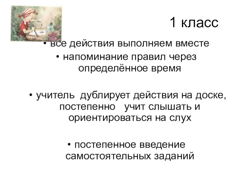 учитель дублирует действия на доске, постепенно учит слышать и ориентироваться на слух