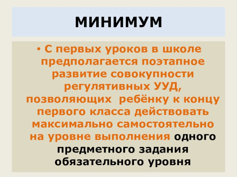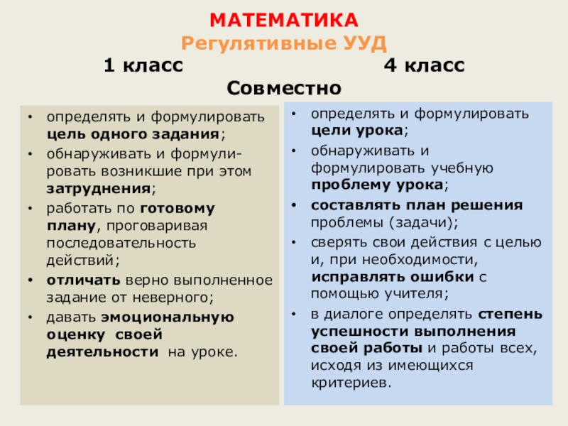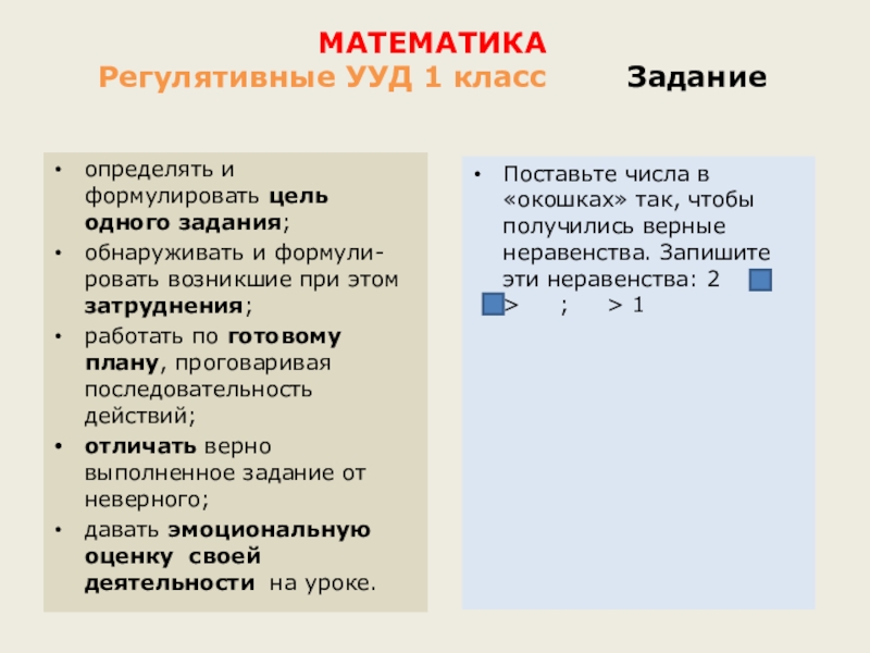 Слайд 1ФОРМИРОВАНИЕ РЕГУЛЯТИВНЫХ УУД МЛАДШИХ ШКОЛЬНИКОВ НА УРОКАХ МАТЕМАТИКИ В ПЕРВОМ КЛАССЕ