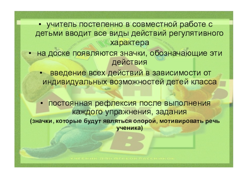 Одновременно мы начинаем работать над совокупностью регулятивных УУД на максимальном для первоклассников уровне: