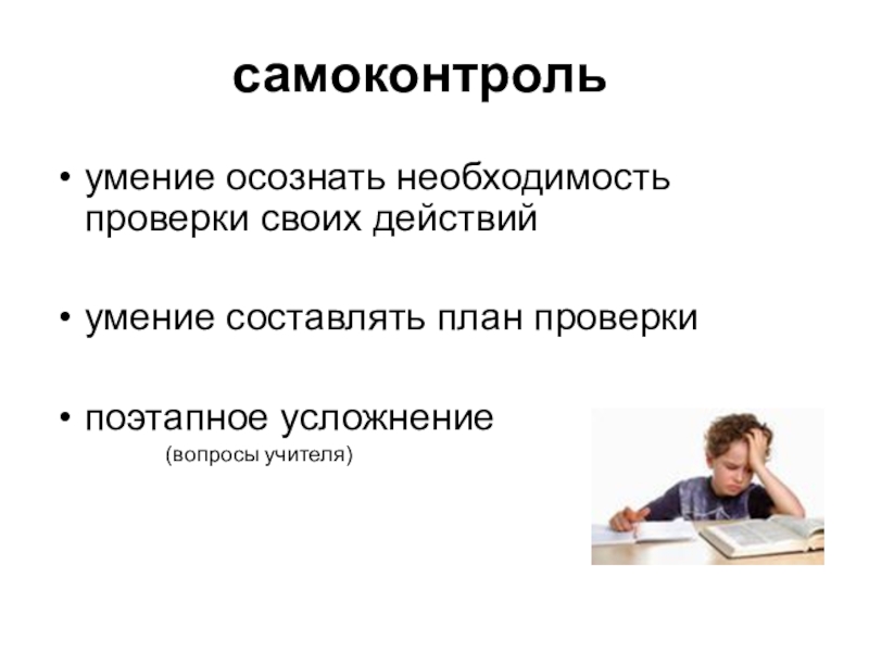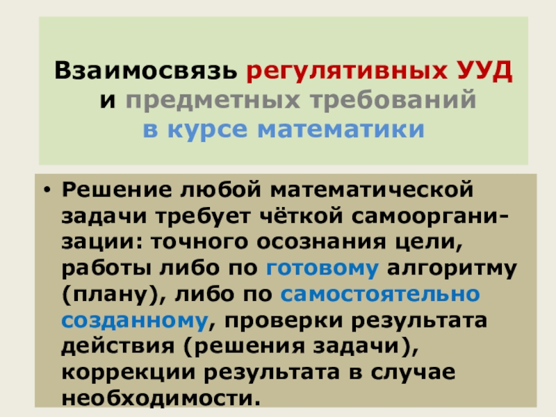 задачи требует чёткой самооргани-зации: точного осознания цели, работы либо по готовому алгоритму (плану), либо по самостоятельно созданному, проверки результата действия (решения задачи), коррекции результата в случае необходимости.