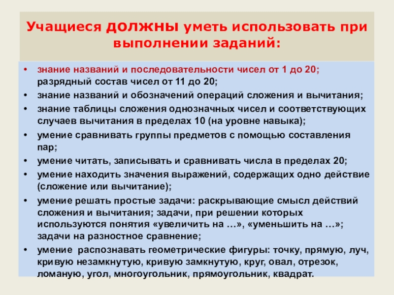 -уметь читать, записывать и сравнивать числа в пределах 20.