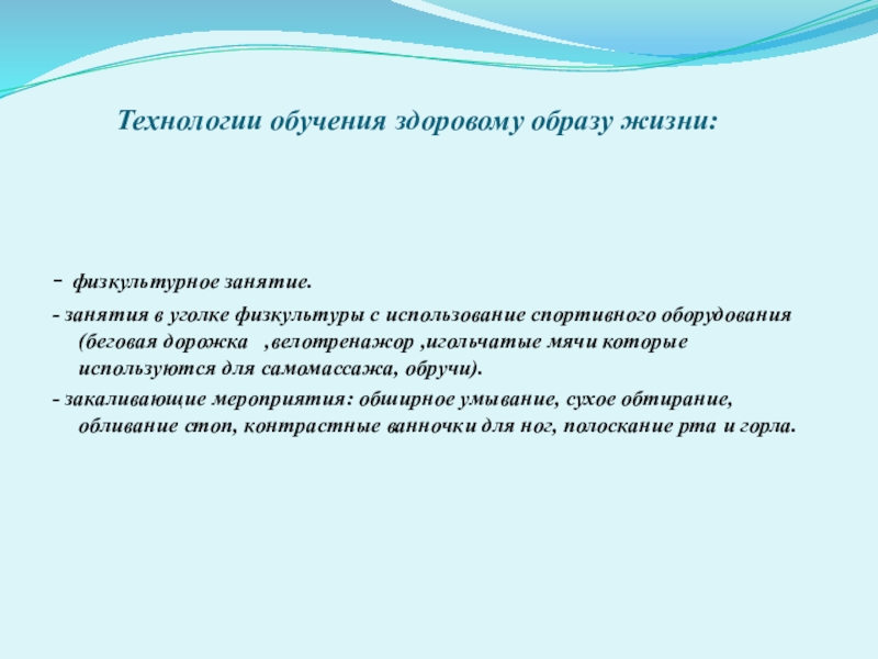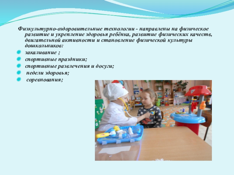 Слайд 10Физкультурно-оздоровительные технологии - направлены на физическое развитие и укрепление здоровья ребёнка, развитие