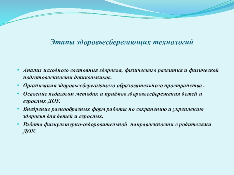 Слайд 14Этапы здоровьесберегающих технологий