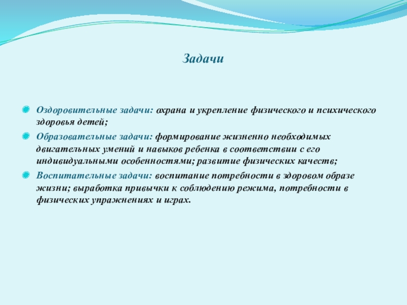 Оздоровительные задачи: охрана и укрепление физического и психического здоровья детей;