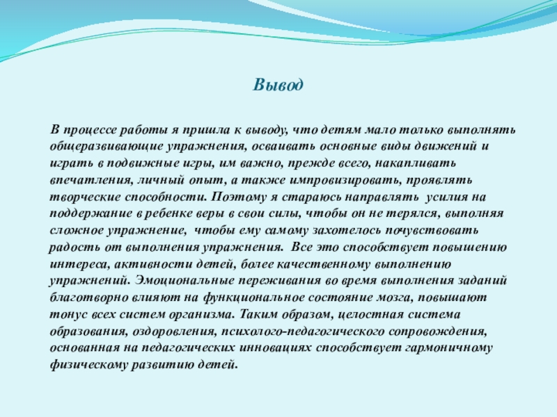 детям мало только выполнять общеразвивающие упражнения, осваивать основные виды движений и играть в подвижные игры, им важно, прежде всего, накапливать впечатления, личный опыт, а также импровизировать, проявлять творческие способности. Поэтому я стараюсь направлять усилия на поддержание в ребенке веры в свои силы, чтобы он не терялся, выполняя сложное упражнение, чтобы ему самому захотелось почувствовать радость от выполнения упражнения. Все это способствует повышению интереса, активности детей, более качественному выполнению упражнений. Эмоциональные переживания во время выполнения заданий благотворно влияют на функциональное состояние мозга, повышают тонус всех систем организма. Таким образом, целостная система образования, оздоровления, психолого-педагогического сопровождения, основанная на педагогических инновациях способствует гармоничному физическому развитию детей.