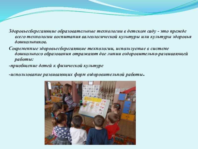 Современные здоровьесберегающие технологии, используемые в системе дошкольного образования отражают две линии оздоровительно-развивающей работы: