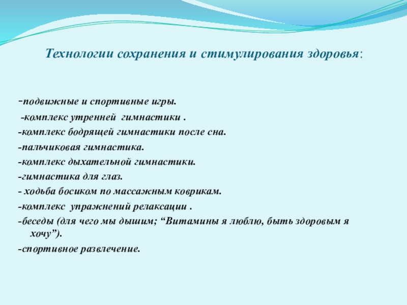 Слайд 19Технологии сохранения и стимулирования здоровья: