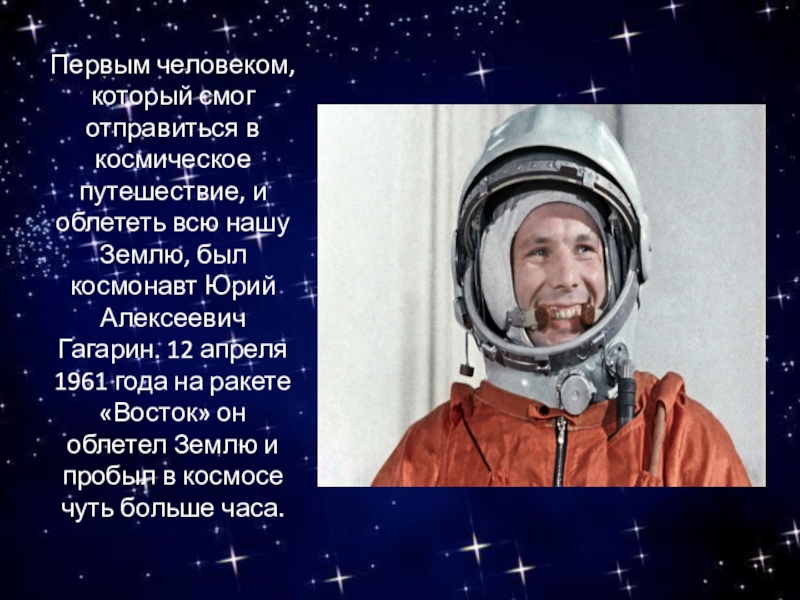 нашу Землю, был космонавт Юрий Алексеевич Гагарин. 12 апреля 1961 года на ракете «Восток» он облетел Землю и пробыл в космосе чуть больше часа.