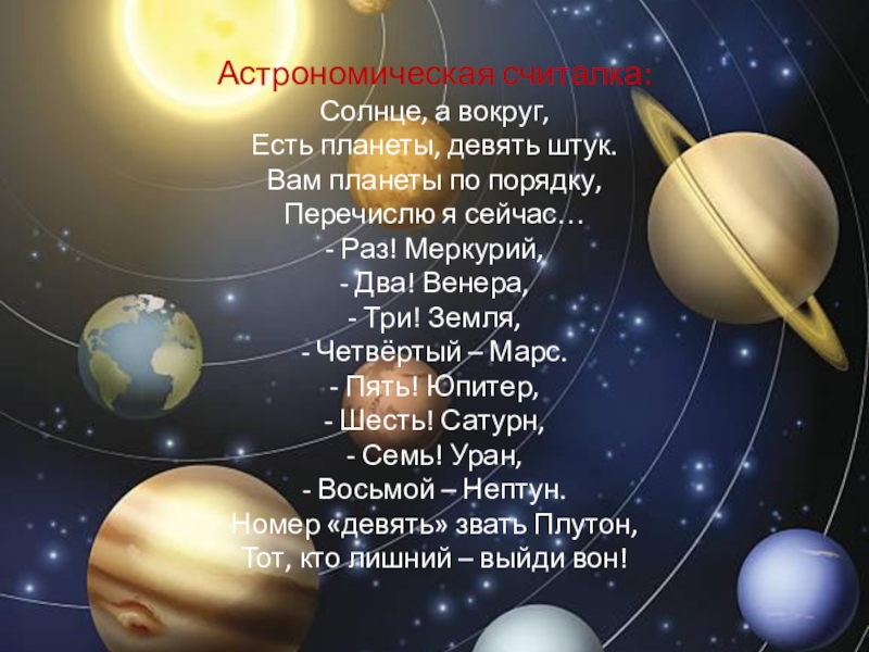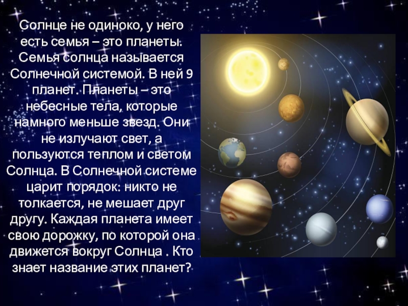солнца называется Солнечной системой. В ней 9 планет. Планеты – это небесные тела, которые намного меньше звезд. Они не излучают свет, а пользуются теплом и светом Солнца. В Солнечной системе царит порядок: никто не толкается, не мешает друг другу. Каждая планета имеет свою дорожку, по которой она движется вокруг Солнца . Кто знает название этих планет?