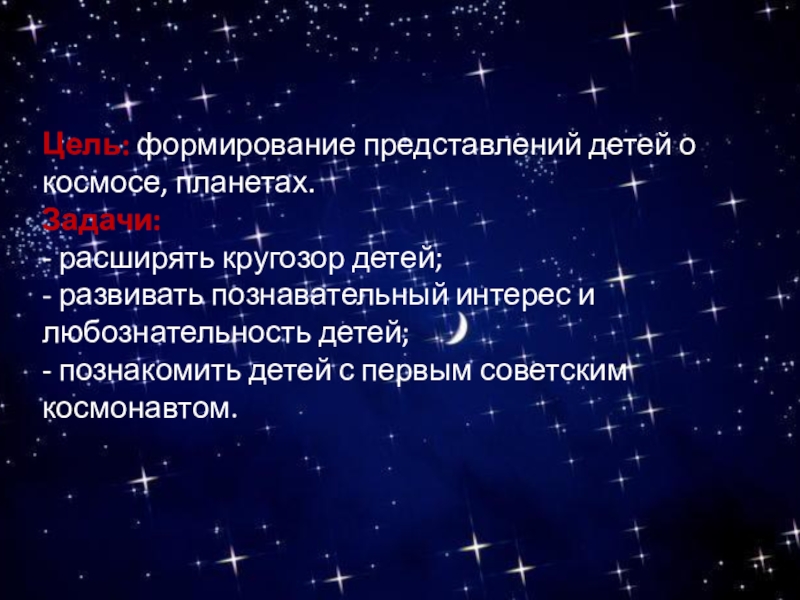 Слайд 2Цель: формирование представлений детей о космосе, планетах.