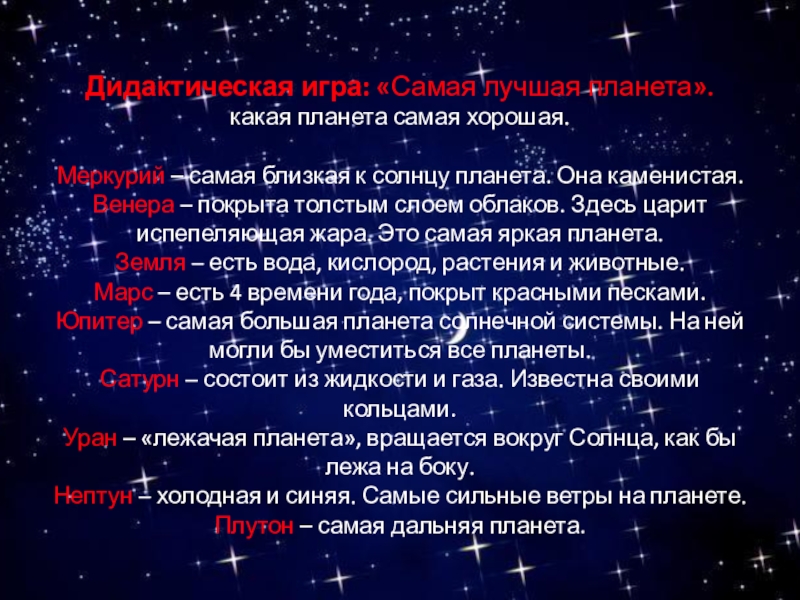 Слайд 15Дидактическая игра: «Самая лучшая планета».