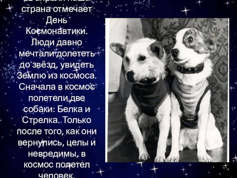 до звёзд, увидеть Землю из космоса. Сначала в космос полетели две собаки: Белка и Стрелка. Только после того, как они вернулись, целы и невредимы, в космос полетел человек.