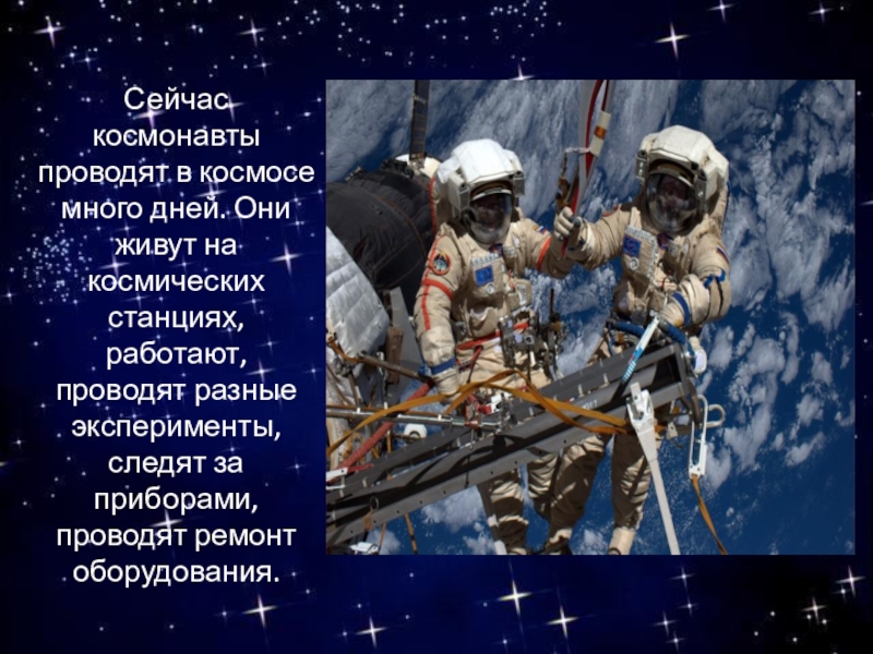 Слайд 5Сейчас космонавты проводят в космосе много дней. Они живут на космических