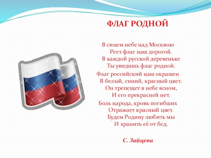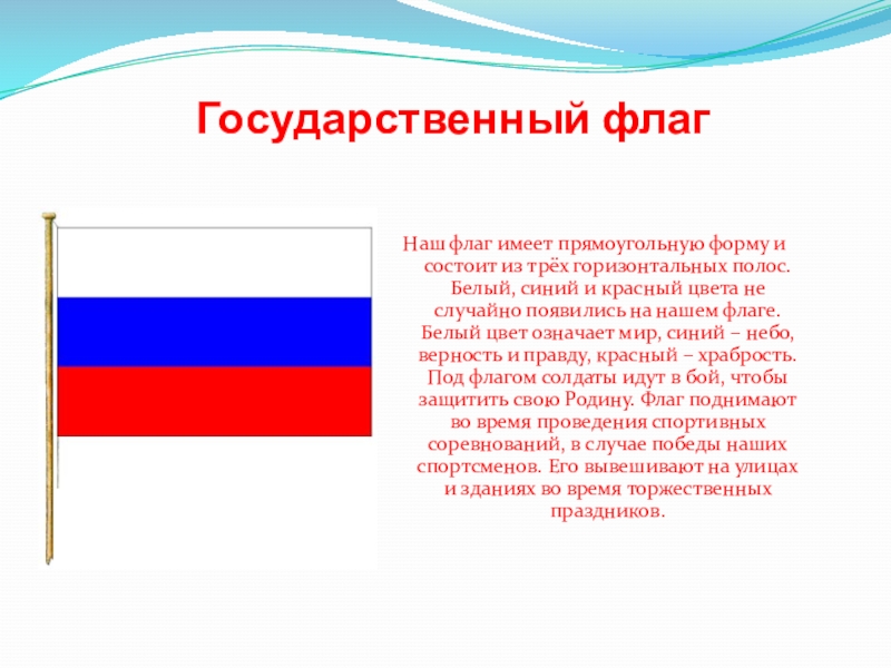 полос. Белый, синий и красный цвета не случайно появились на нашем флаге. Белый цвет означает мир, синий – небо, верность и правду, красный – храбрость. Под флагом солдаты идут в бой, чтобы защитить свою Родину. Флаг поднимают во время проведения спортивных соревнований, в случае победы наших спортсменов. Его вывешивают на улицах и зданиях во время торжественных праздников.