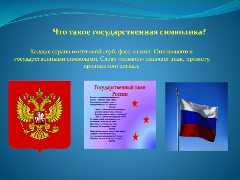 Они являются государственными символами. Слово «символ» означает знак, примету, признак или сигнал.