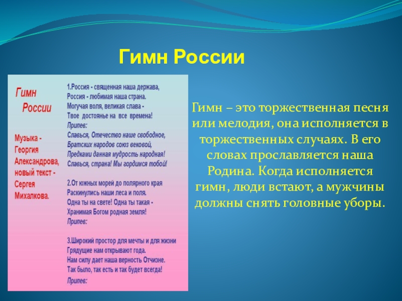 торжественных случаях. В его словах прославляется наша Родина. Когда исполняется гимн, люди встают, а мужчины должны снять головные уборы.