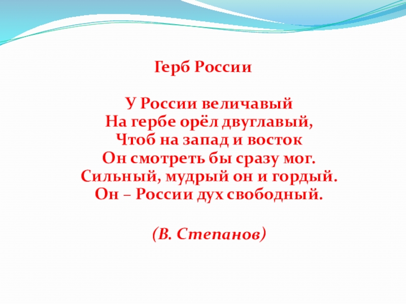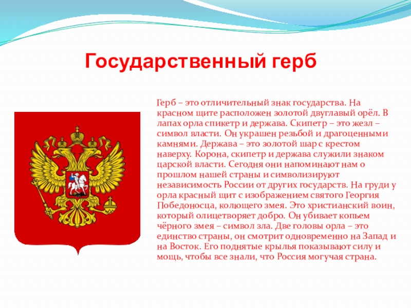 красном щите расположен золотой двуглавый орёл. В лапах орла спикетр и держава. Скипетр – это жезл – символ власти. Он украшен резьбой и драгоценными камнями. Держава – это золотой шар с крестом наверху. Корона, скипетр и держава служили знаком царской власти. Сегодня они напоминают нам о прошлом нашей страны и символизируют независимость России от других государств. На груди у орла красный щит с изображением святого Георгия Победоносца, колющего змея. Это христианский воин, который олицетворяет добро. Он убивает копьем чёрного змея – символ зла. Две головы орла – это единство страны, он смотрит одновременно на Запад и на Восток. Его поднятые крылья показывают силу и мощь, чтобы все знали, что Россия могучая страна.