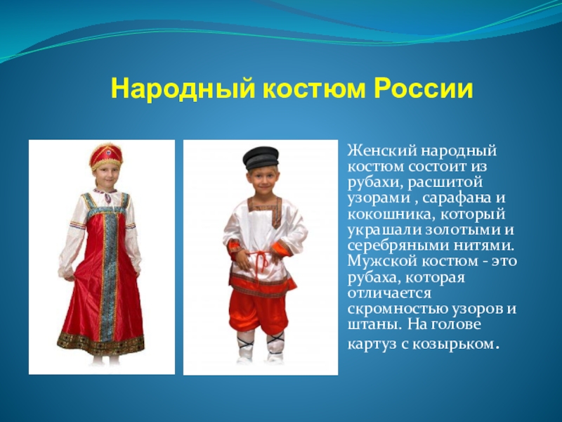 сарафана и кокошника, который украшали золотыми и серебряными нитями. Мужской костюм - это рубаха, которая отличается скромностью узоров и штаны. На голове картуз с козырьком.