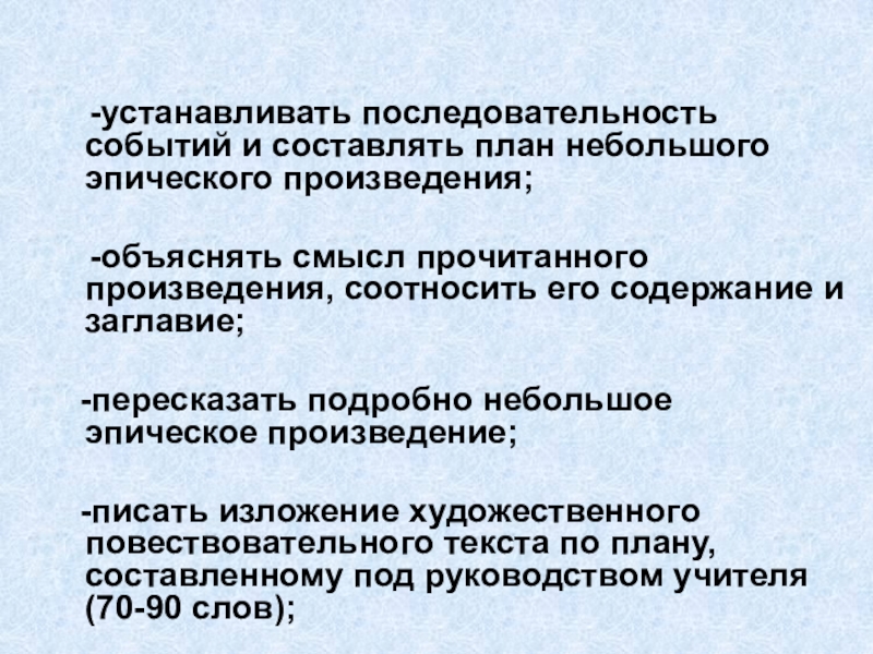 Слайд 5 -устанавливать последовательность событий и составлять план небольшого эпического произведения;