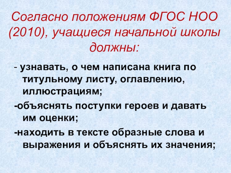 Слайд 3Согласно положениям ФГОС НОО (2010), учащиеся начальной школы должны: