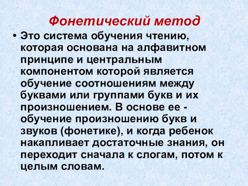 центральным компонентом которой является обучение соотношениям между буквами или группами букв и их произношением. В основе ее - обучение произношению букв и звуков (фонетике), и когда ребенок накапливает достаточные знания, он переходит сначала к слогам, потом к целым словам.
