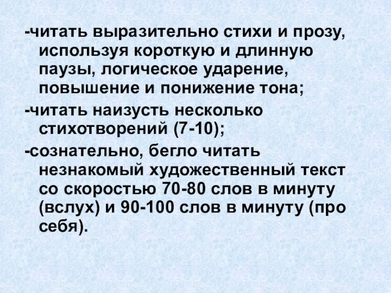 -сознательно, бегло читать незнакомый художественный текст со скоростью 70-80 слов в минуту (вслух) и 90-100 слов в минуту (про себя).