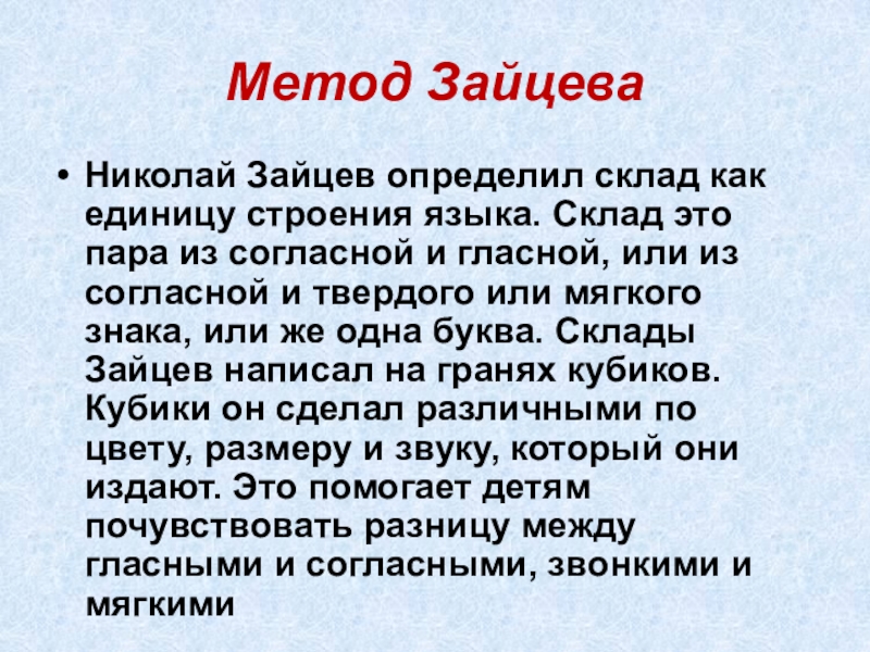 пара из согласной и гласной, или из согласной и твердого или мягкого знака, или же одна буква. Склады Зайцев написал на гранях кубиков. Кубики он сделал различными по цвету, размеру и звуку, который они издают. Это помогает детям почувствовать разницу между гласными и согласными, звонкими и мягкими