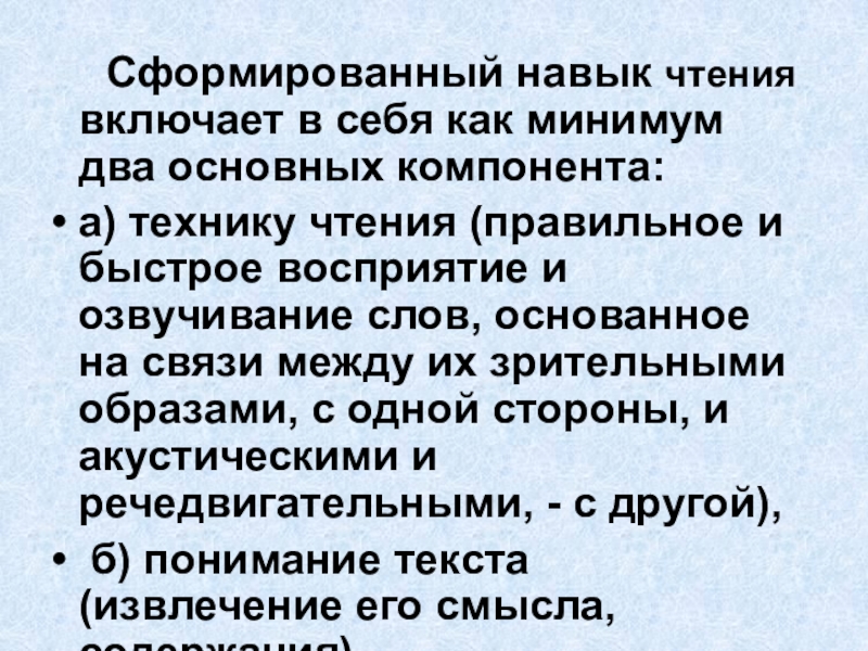 Слайд 6 Сформированный навык чтения включает в себя как минимум