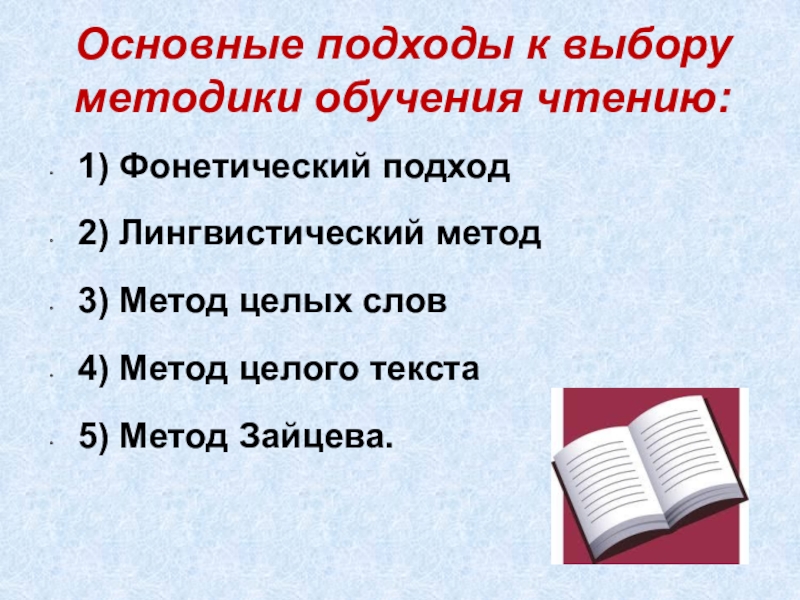 Слайд 10Основные подходы к выбору методики обучения чтению: