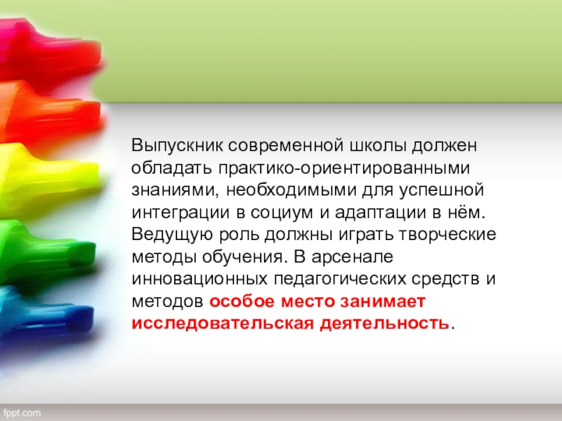 Ведущую роль должны играть творческие методы обучения. В арсенале инновационных педагогических средств и методов особое место занимает исследовательская деятельность.