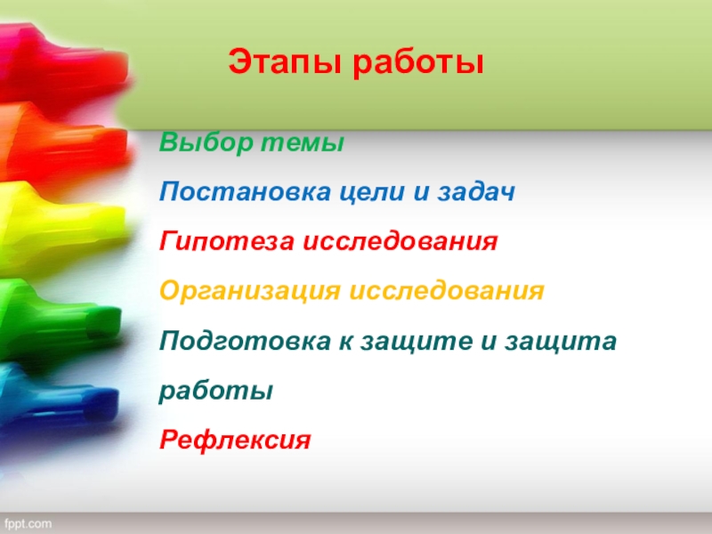 Этапы работыВыбор темыПостановка цели и задачГипотеза исследованияОрганизация исследованияПодготовка к защите и защита работыРефлексия