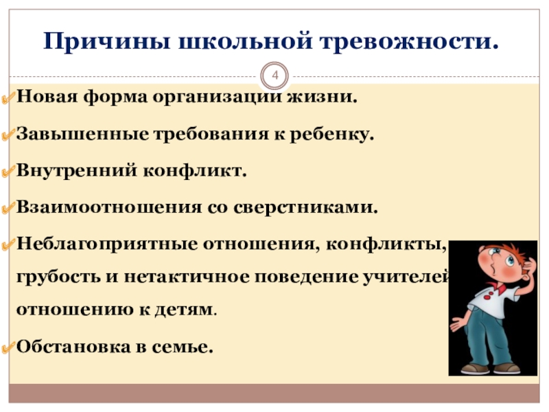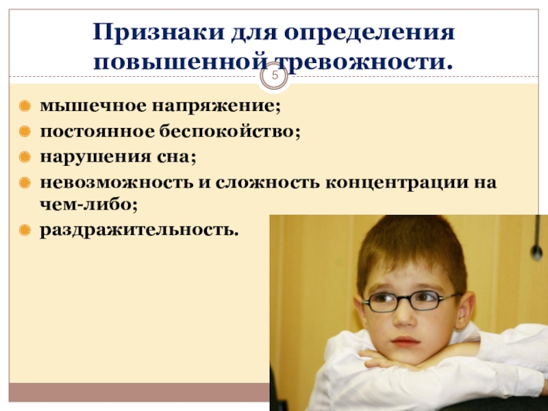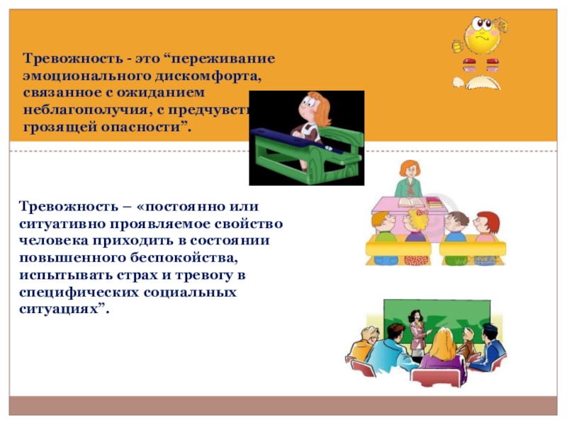 Тревожность – «постоянно или ситуативно проявляемое свойство человека приходить в состоянии повышенного беспокойства, испытывать страх и тревогу в специфических социальных ситуациях”.