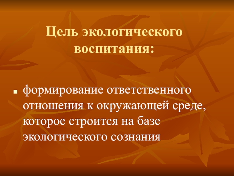 Цель экологического воспитания:формирование ответственного отношения к окружающей среде, которое строится на базе экологического сознания