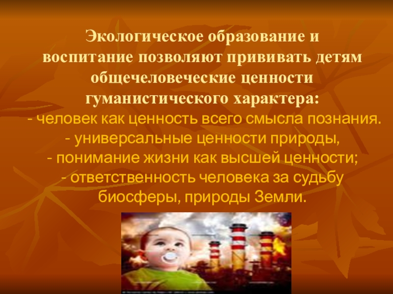 Слайд 15 Экологическое образование и воспитание позволяют прививать детям общечеловеческие ценности гуманистического характера: -