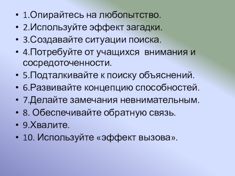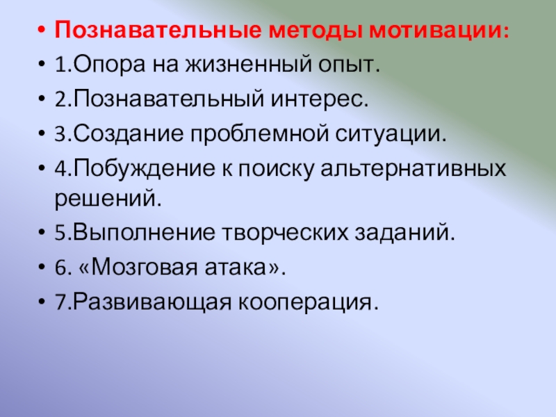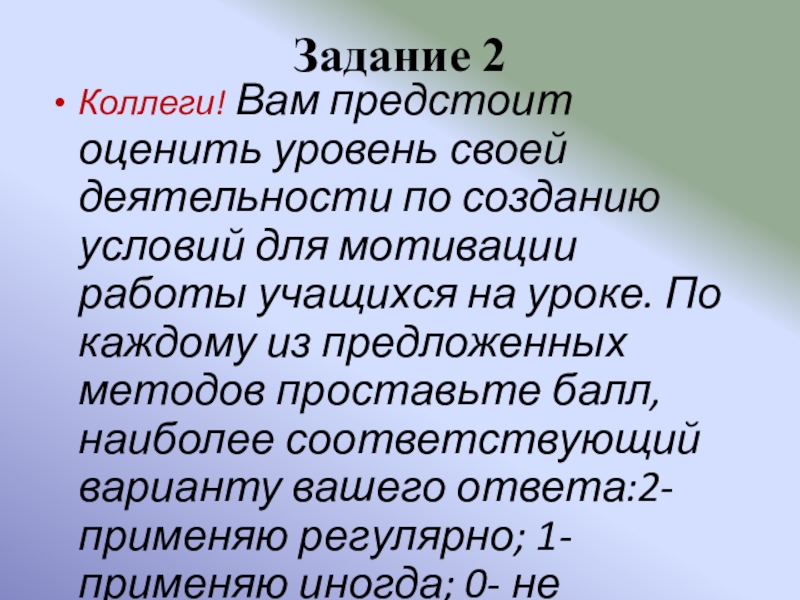 для мотивации работы учащихся на уроке. По каждому из предложенных методов проставьте балл, наиболее соответствующий варианту вашего ответа:2-применяю регулярно; 1-применяю иногда; 0- не применяю.