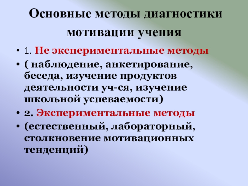 (естественный, лабораторный, столкновение мотивационных тенденций)