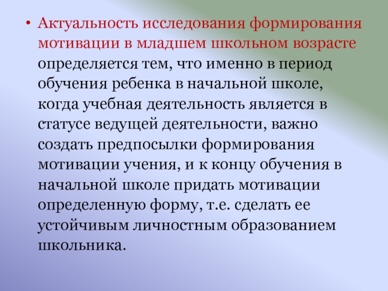 Слайд 4Актуальность исследования формирования мотивации в младшем школьном возрасте определяется тем, что