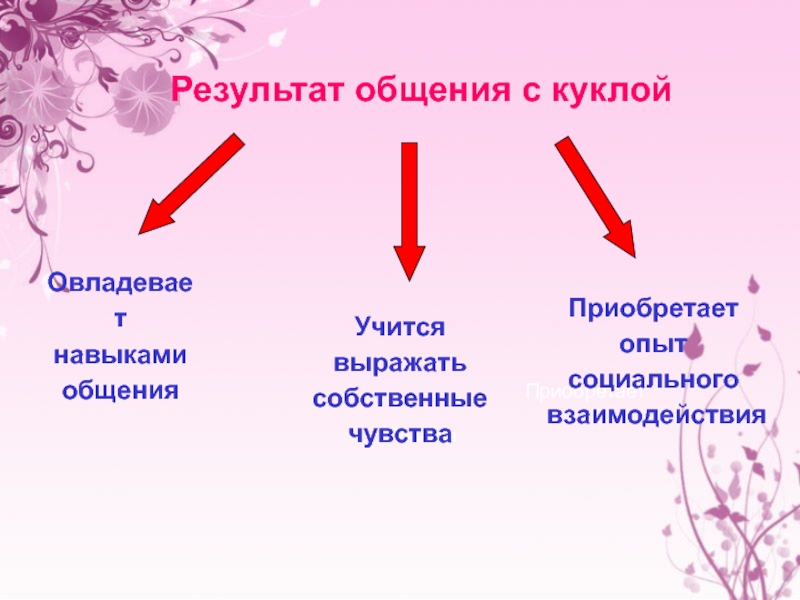 Результат общения с куклойОвладевает навыками общенияУчится Учится выражать собственные чувстваПриобретает Приобретает опыт социального взаимодействия
