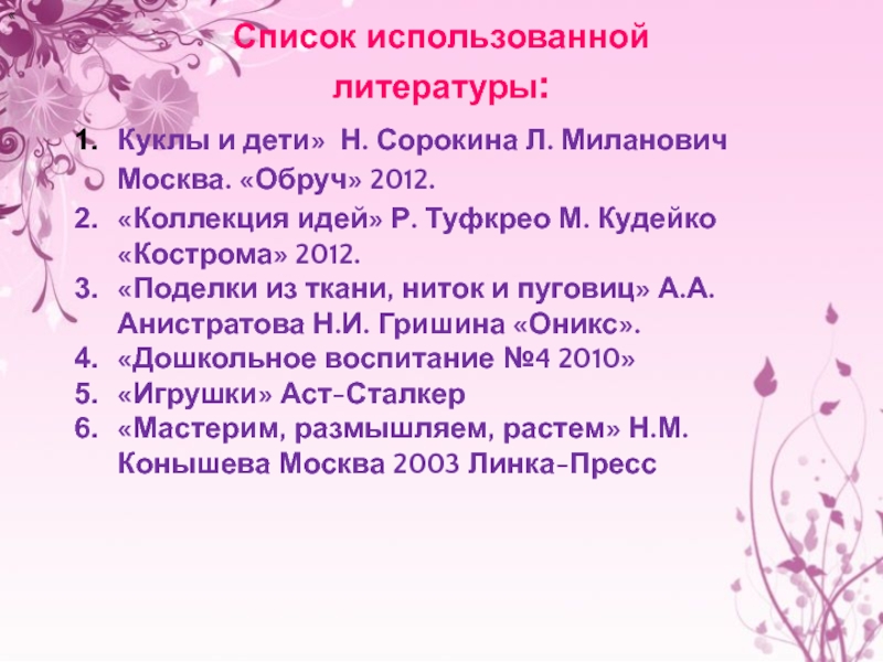 Список использованной  литературы:«Куклы и дети» Н. Сорокина Л. Миланович Москва. «Обруч» 2012.«Коллекция идей» Р. Туфкрео М.